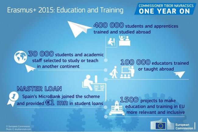 Tra queste segnaliamo quella dedicata ai numeri europei rispetto alla partecipazione al Programma Erasmus+ nel 2015: 400 mila studenti e tirocinanti hanno svolto mobilità all’estero, 30 mila studenti e staff accademico hanno studiato lavorato in atenei dei 5 continenti, grazie alla mobilità internazionale. Un buon inizio si registra anche nel sistema di Garazia dei Prestiti per gli studenti: la spagnola Micro Bank ha stanziato 1 milione di euro per questa iniziativa a vantaggio degli studenti. Ottimi risultati anche nell’ambito della formazione professionale, con 100 educatori formati all’estero. Infine, grazie ad Erasmus+ sono stati finanziati 1.500 progetti di cooperazione per rendere l’istruzione e la formazione in Europa più rilevante ed inclusiva.