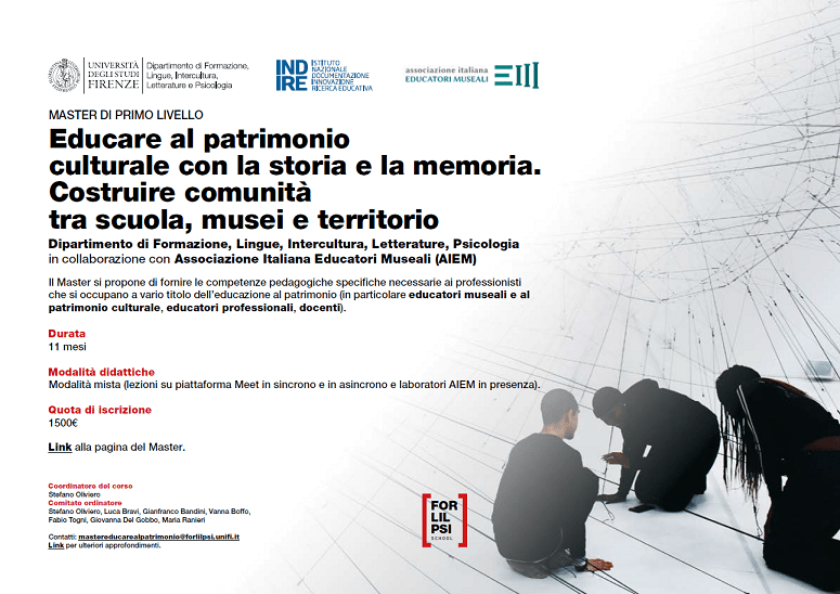 Sono aperte le iscrizioni al Master di I livello “Educare al patrimonio culturale con la storia e la memoria. Costruire comunità tra scuola, musei e territorio”, promosso dal Dipartimento di Formazione, Lingue, Intercultura, Letterature, Psicologia dell’Università di Firenze, in collaborazione con Associazione Italiana Educatori Museali (AIEM) e INDIRE.