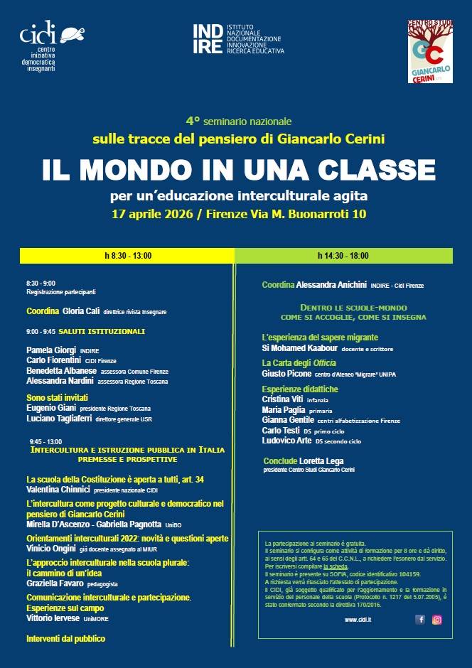 Venerdì 17 aprile la sede centrale INDIRE a Firenze (Palazzo Gerini) ospita il 4° seminario nazionale del CIDI, uno degli appuntamenti del ciclo di incontri avviati nel 2023 per dare continuità e valorizzare il lavoro di Giancarlo Cerini, ispettore e vicepresidente nazionale del CIDI, partecipe e animatore di molte pubblicazioni, iniziative culturali e normative nella scuola pubblica degli ultimi 25 anni, prematuramente scomparso nel 2021.
