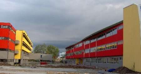 L’atrio interno si articola in piani sovrapposti e ballatoi che, illuminati dalla vetrata continua a tutta altezza, diventano spazi vivibili da dove si percepisce il variare del tempo atmosferico e della luce solare. I vari elementi sono distinti anche grazie al piano del colore, che alterna i rossi delle colonne con la campiture gialle e verdi delle pareti, rendendo l’insieme un ambiente vivace e accogliente, che consente e facilita i contatti e la socializzazione. Anche la struttura frangisole, distanziata dalla facciata, crea con il suo andamento curvilineo e le sue ombreggiature uno spazio di sosta e di passaggio.