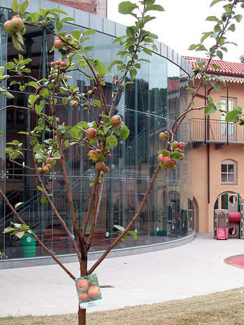 Una siepe cromatica-sensoriale di perimetrazione permette ai bambini di osservare il susseguirsi delle stagioni mediante la percezione dei profumi e del variare dei colori, mentre un ampio pergolato offre un riparo per le lezioni all’aperto. Il giardino comprende anche alcune piastre per il gioco attrezzato, una siepe-labirinto per i più piccoli, un giardino roccioso, e una scacchiera gattonabile con piante aromatiche.