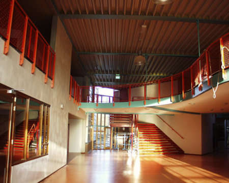 Forme e colori nell’atrio di ingresso. Il dinamismo e la vivacità degli spazi si accordano con la sensibilità dei giovani, propria di un’età di forti contrapposizioni e discontinuità emotive. (foto RAU)
