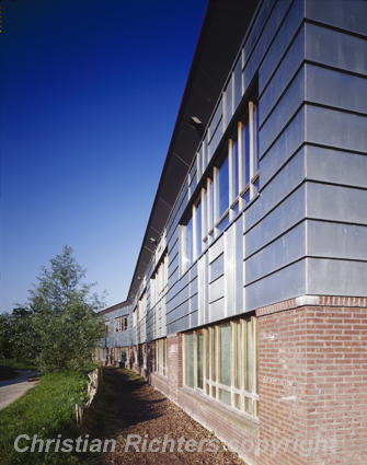 Le lastre in lamiera zincata ad andamento orizzontale contrastano con la verticalità degli infissi delle finestre, in legno di cedro rosso. (foto Christian RICHTERS )