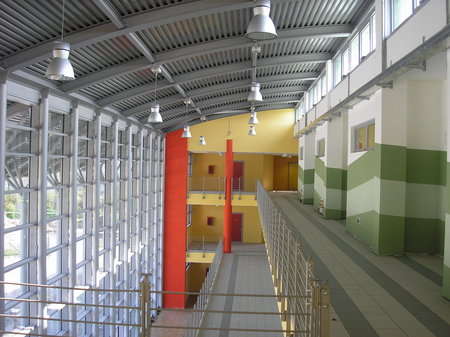 Anche la vetrata strutturale che copre la scala di sicurezza è studiata in modo da integrare le esigenze architettoniche di vivibilità con l’uso di energie alternative: i moduli fotovoltaici sono alternati con vetri colorati, capaci di creare vivaci effetti all’interno.