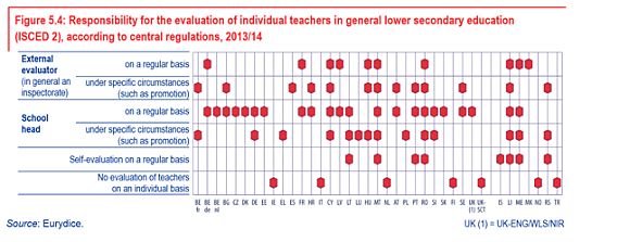 Come si può vedere, una qualche forma di valutazione degli insegnanti regolata a livello centrale è presente in tutti i Paesi eccetto l'Irlanda, l'Italia, l'Olanda, la Finlandia, la Scozia, la Norvegia e la Turchia. In questi Paesi, tuttavia, molto spesso le scuole sono libere di organizzare in maniera autonoma le proprie strategie di sviluppo professionale degli insegnanti, incluse forme di valutazione delle loro performance. Nella maggior parte dei Paesi in cui esiste un sistema di valutazione, il dirigente scolastico è responsabile della valutazione degli insegnanti, che sia su base regolare o in specifiche circostanze, come nel caso di un cambiamento di mansione, di una promozione o di un problema relativo ai metodi di insegnamento. In 17 sistemi educativi, la valutazione è effettuata da un valutatore esterno, su base regolare o ad hoc. In ogni caso, salvo pochissime eccezioni, la valutazione da parte di un esperto esterno viene integrata dalla valutazione effettuata dal dirigente scolastico.
