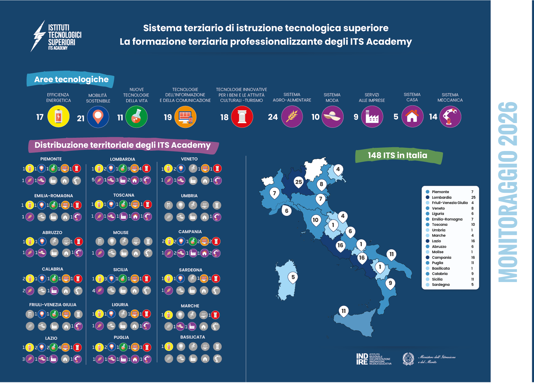 L’Indire, su incarico del Ministero dell’Istruzione, realizza e gestisce la banca dati degli Istituti Tecnologici Superiori (ITS Academy), contribuisce alla definizione dei criteri di monitoraggio e di valutazione dei percorsi ITS Academy, realizza il monitoraggio nazionale ed elabora rapporti di monitoraggio che vengono messi a disposizione del Tavolo Tecnico Nazionale Paritetico degli ITS Academy.